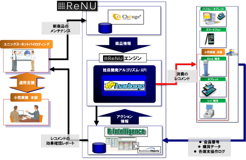 『ReNU』は、ドラッグストアにおける購買活動や各種の販促活動によるリアクションを適切に蓄積・集計し、ネットパイロティングの【@Change】と同時並行的に二次加工する事で、今までの年齢や性別などの基礎的なマーケット属性情報では可視化が困難だった「消費者プロファイリング」をより多面的かつ効率的に形成し、「誰が、いつ、何を、幾らで、どのように購入したいか」を算出します。小売に留まらず流通業界全体において様々なシーンでビッグデータの有効活用を実現します。