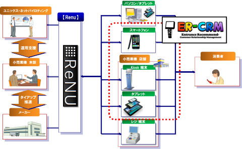データの収集および配信において「消費者が買い物をする直前」が最適との考えから、「店頭=Entrance」を中心としたCRMを販売促進および接客に活用するサービス。『ReNU』のデータを活用する事により、小売業はお客様の継続購買カテゴリーの定着化や新カテゴリーにおける需要発掘を実現する。【ER-CRM】は以下のコンポーネントで構築される。